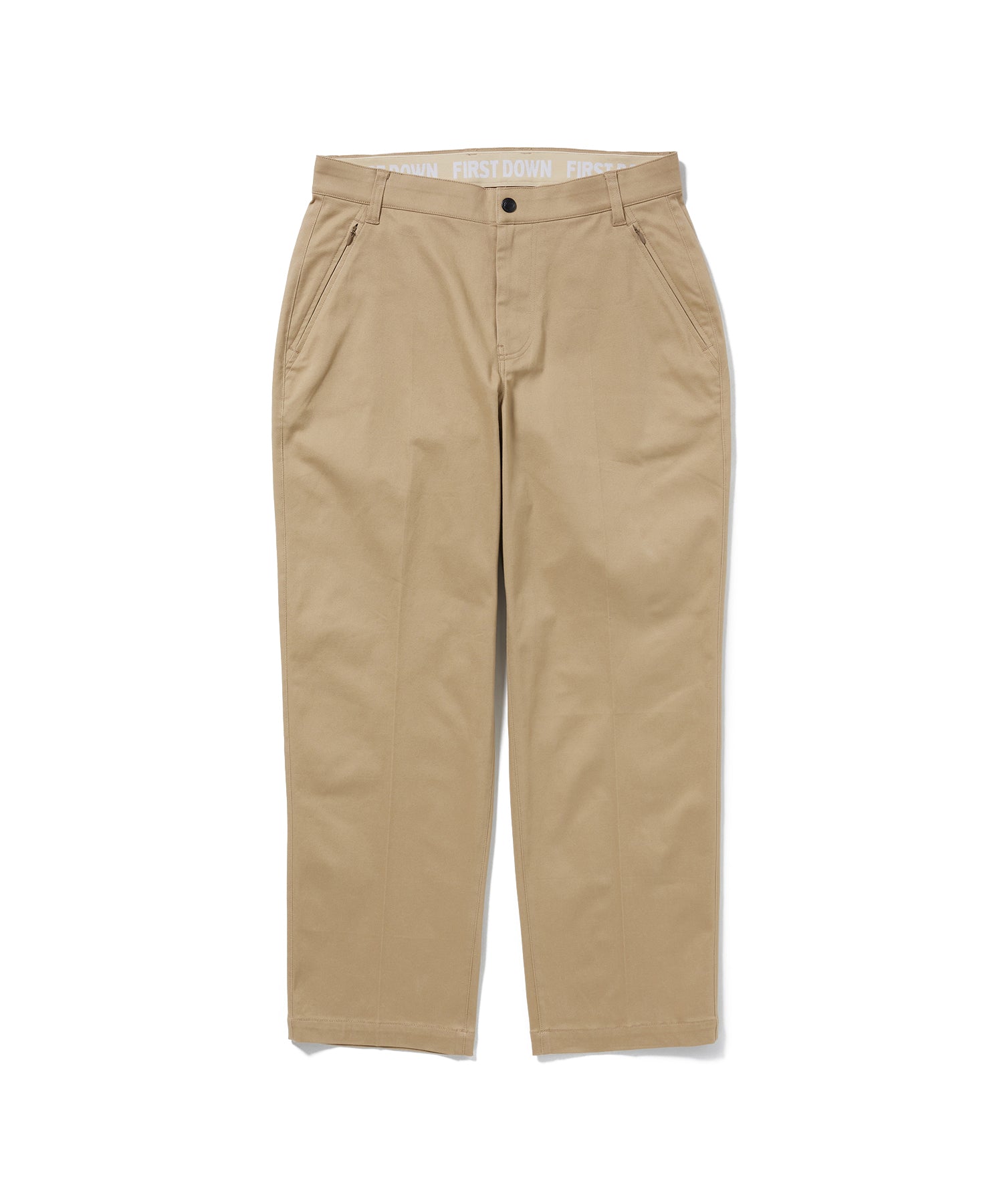 ミリタリーやワークの要素をベースに、現代的なシルエットへとアップデートしたユーティリティチノパンツ。股下にガゼットクロッチを採用し、動きやすさと快適な着用感を実現。立体的なワイドストレートシルエットに加え、センタープレスを施すことで、カジュアルながらも品のあるルックスに仕上がっています。フロントはスナップボタン仕様、ウエスト内側には「FIRST DOWN」ロゴ入りのジャカードニットテープを配し、見えない部分にもブランドのこだわりをプラスしています。