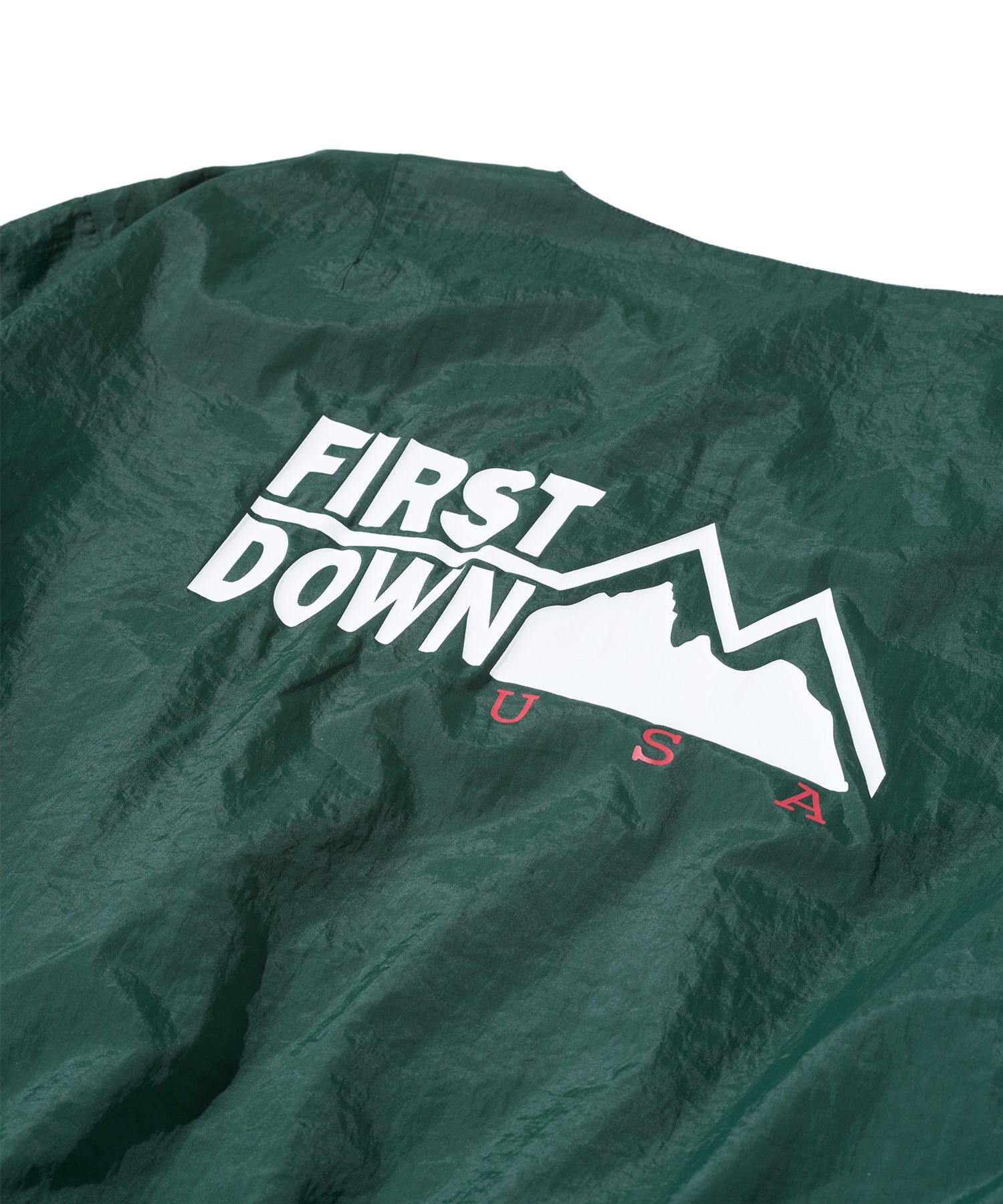 クラシックなフライトジャケットをベースに、ノーカラー×リバーシブル仕様で現代的に再構築したブルゾンジャケット。表側は胸元にロゴ刺繍を配したシンプルなデザイン、裏側は大胆な「FIRST DOWN」ロゴプリントが目を引くグラフィック仕様。裾・袖はリブ仕様、シルエットはゆったりとしたボックス型で、インナーを選ばずレイヤードしやすい設計です。前後どちらを表にしても使えるリバーシブル仕様で、1着で2通りの表情を楽しめます。