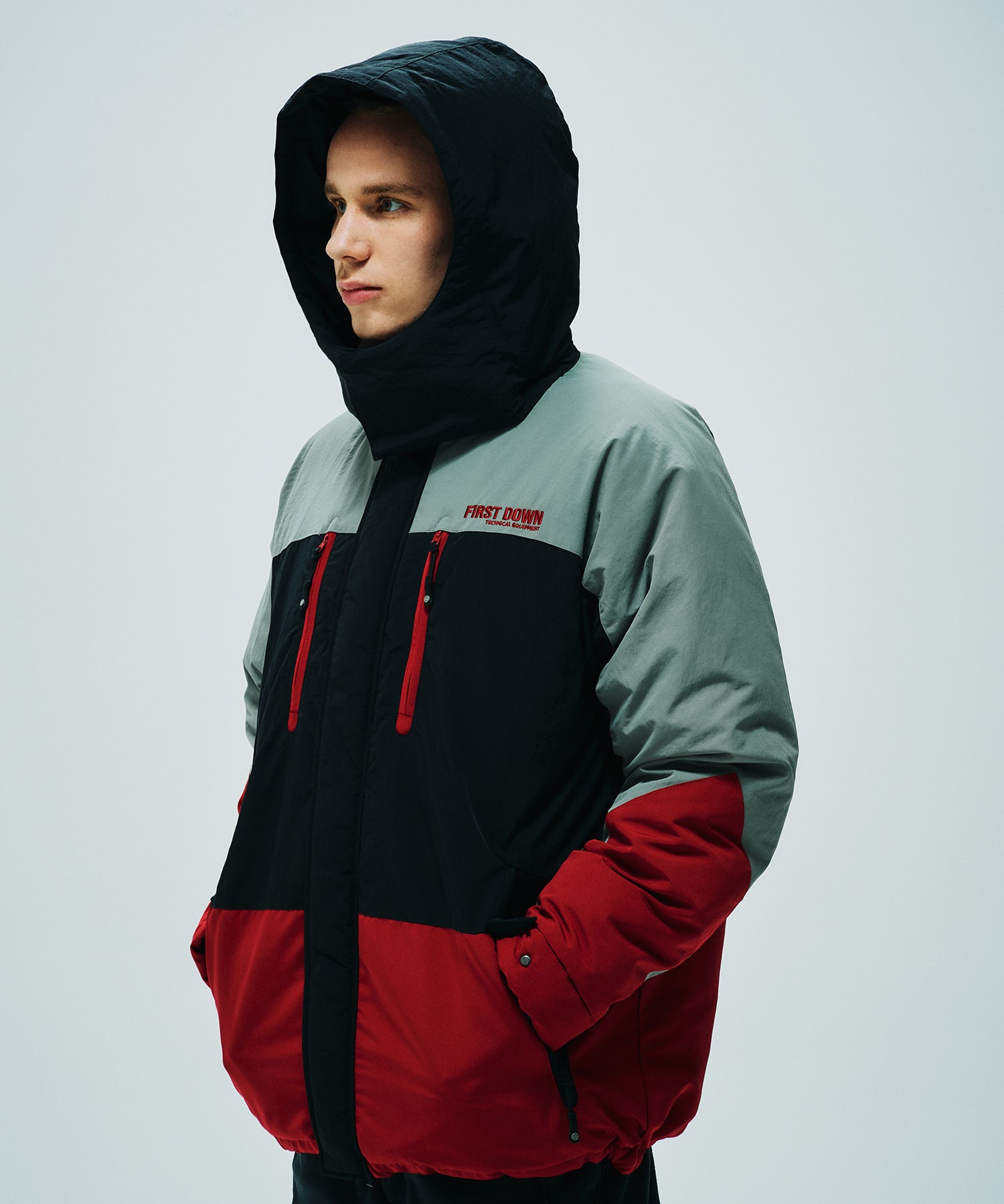 90年代のアーカイブモデルを現代へモディファイした1着。重厚感のあるマルチブロッキングデザインが目を引くフードダウンジャケット。身頃、フード、袖、カフスに至るまで配色と素材切替が施され、クラシックでありながらも現代的なストリートシルエットに昇華されています。フロントの比翼ボタン、フード脱着ZIP、立体ポケット、アジャスタブルカフスなど、機能性とデザイン性を融合した完成度の高いディテールが満載です。