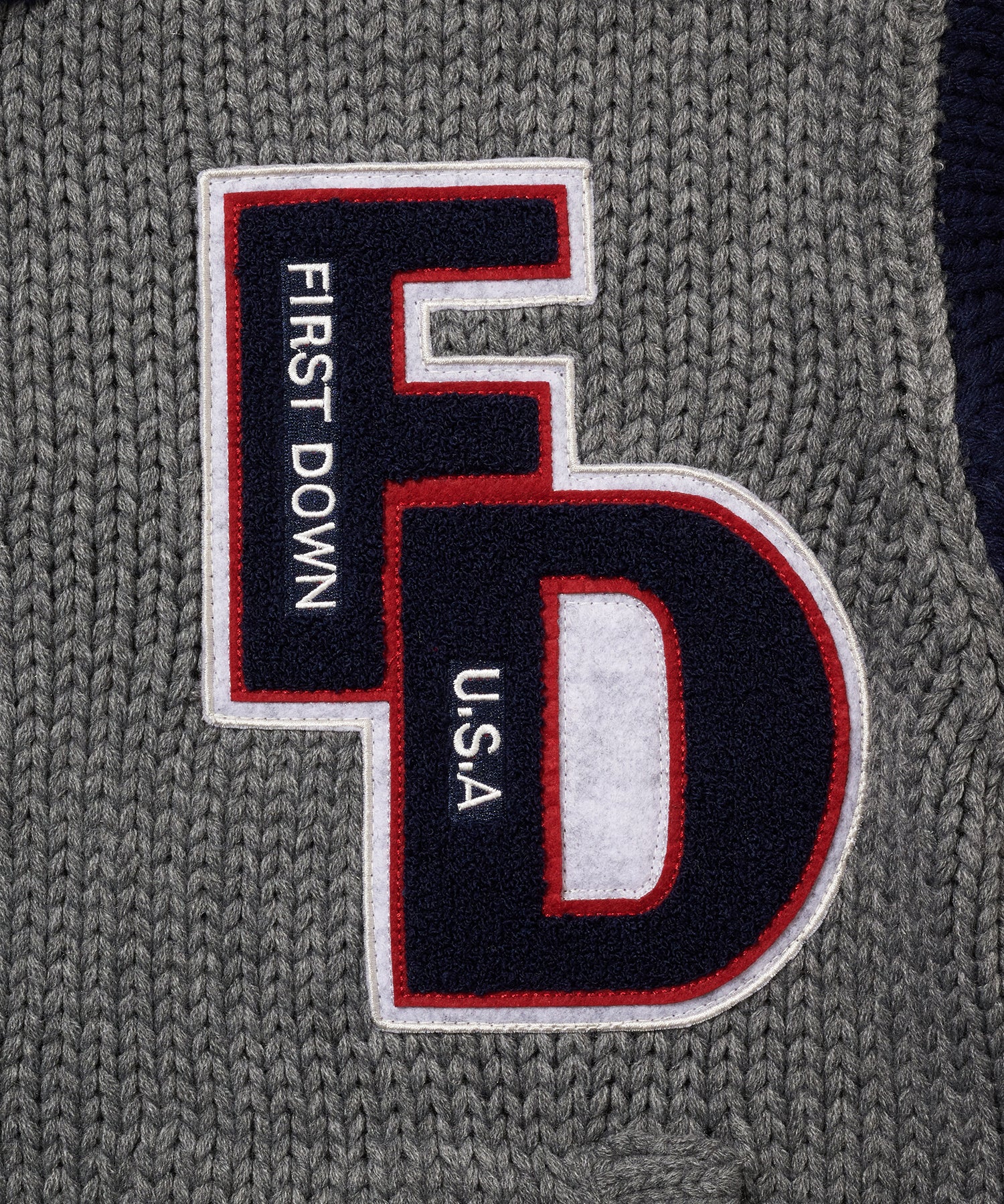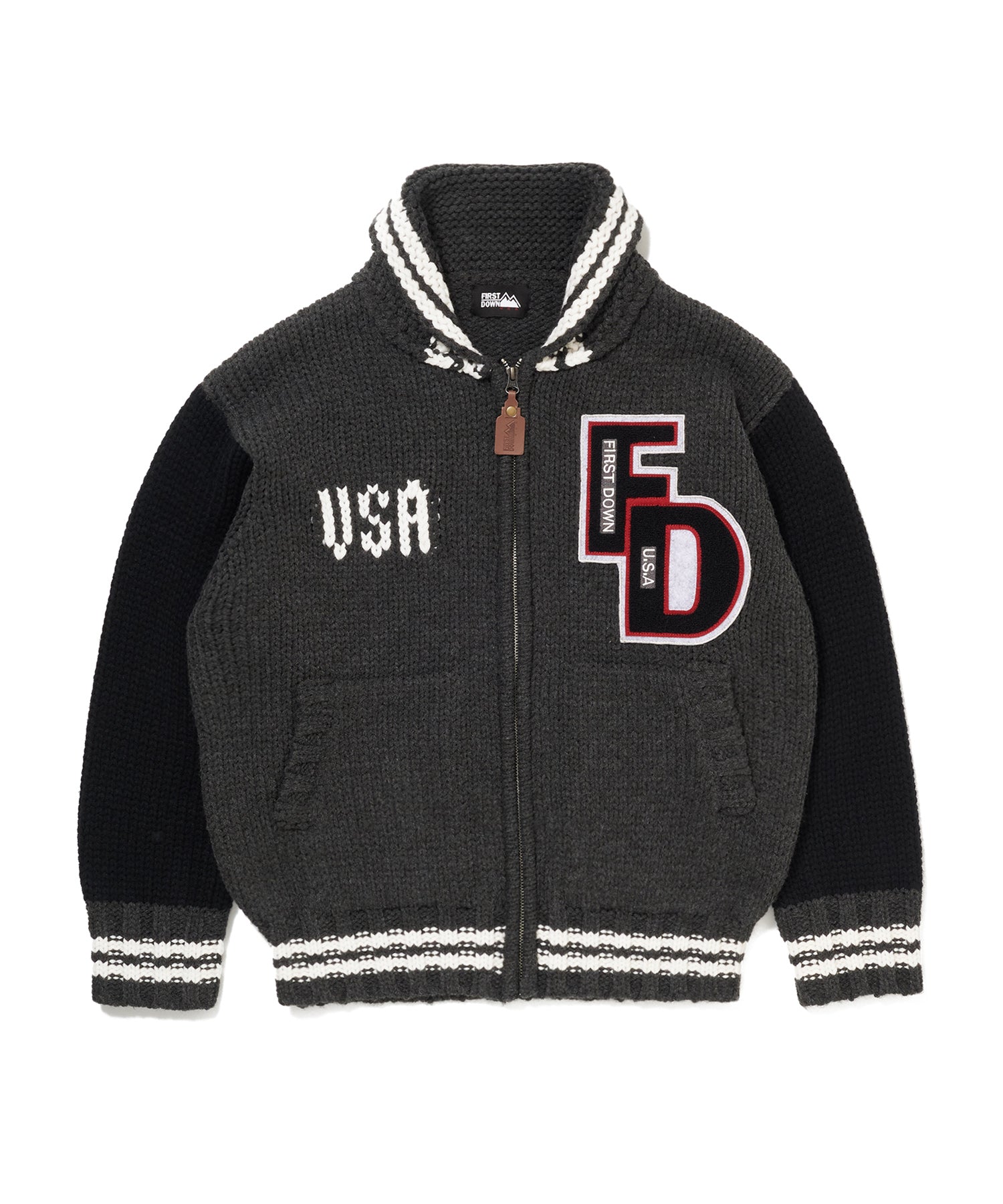 ヴィンテージのスタジャンを彷彿とさせるデザインに、ローゲージニットの柔らかさを融合させたニットスタジアムジャケット。胸元には「USA」ロゴと「FIRST DOWN 」ワッペンを大胆に配置し、アメカジライクなインパクトを演出。袖口・裾・襟の3ラインリブや、レザー調のPU引き手付きZIPなど、細部にもこだわりを込めています。立体的なシルエットと暖かみのある風合いが特徴で、タウンユースにも映える1着です 。